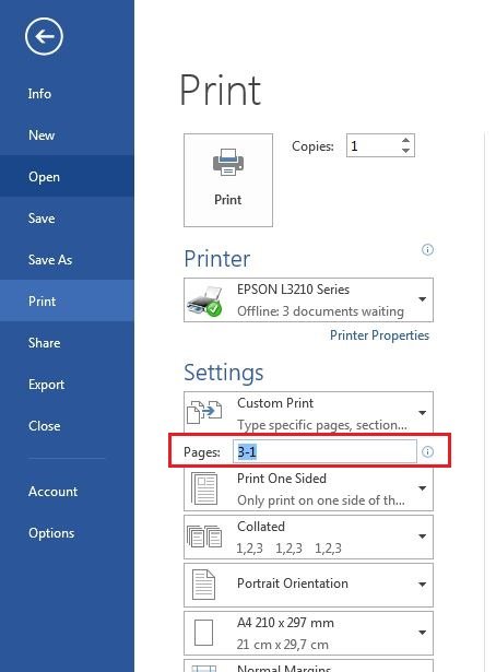 - Selanjutnya pada kolom pages tuliskan angka halaman terakhir sampai halaman pertama contohnya seperti ini 3-1. Karena Admin hanya punya 3 halaman maka dimulai dari halaman 3 sampai halaman 1.