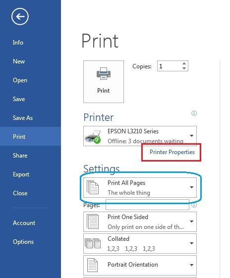 - Setelah muncul menu print klik Printer Properties nanti akan muncul popup baru. Dibagian Settings harus diubah menjadi Print All Pages.