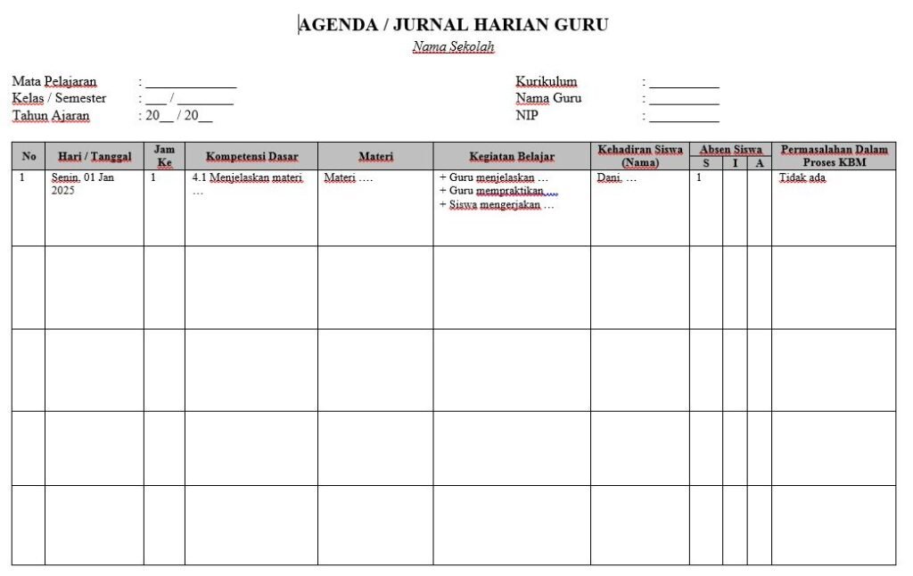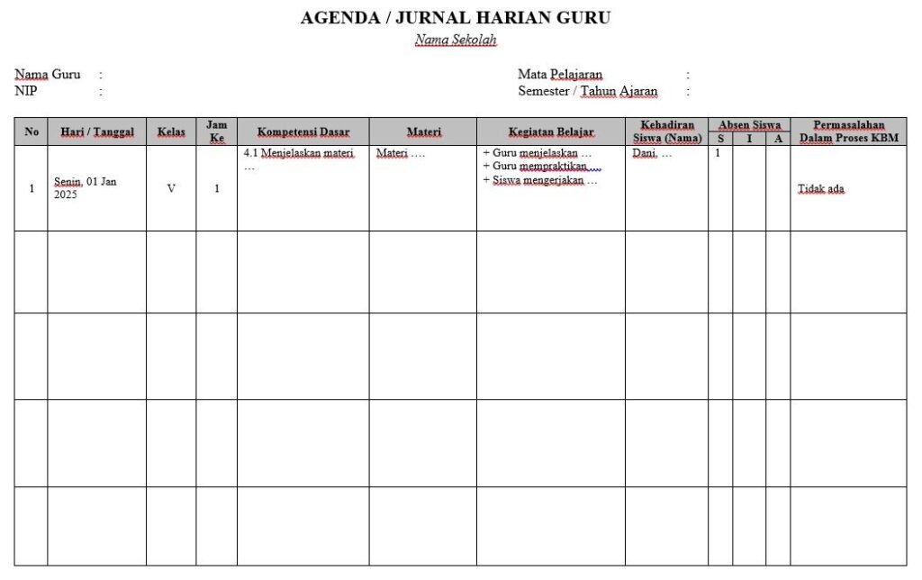 Agenda atau jurnal harian guru merupakan dokumen penting untuk mencatat kegiatan pembelajaran setiap hari di kelas. Melalui halaman ini, kami menyediakan agenda/jurnal harian guru yang bisa Anda download secara gratis dan siap digunakan. Format yang tersedia dirancang sederhana, rapi, dan sesuai dengan kebutuhan administrasi guru, sehingga memudahkan pencatatan materi, kegiatan, serta evaluasi pembelajaran secara teratur.