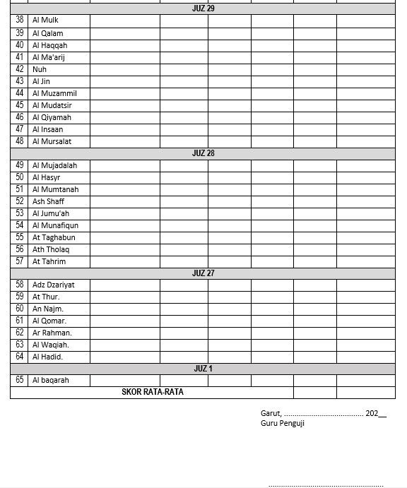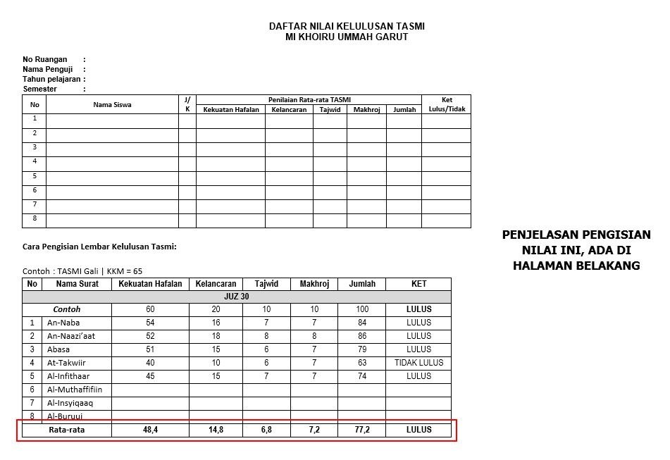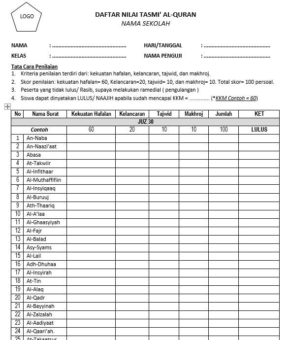 Sebelumnya kita sudah bahas mengenai Lembar Setoran Hafalan Tahfidz, jika kalian ingin melihat atau mendownload filenya kalian bisa klik link disini. Kali ini kita akan bahas mengenai format penilaian tasmi secara lengkap mulai dari lembar nilai untuk ujian sampai hasil akhirnya sebagai acuan untuk dimasukan kedalam raport.