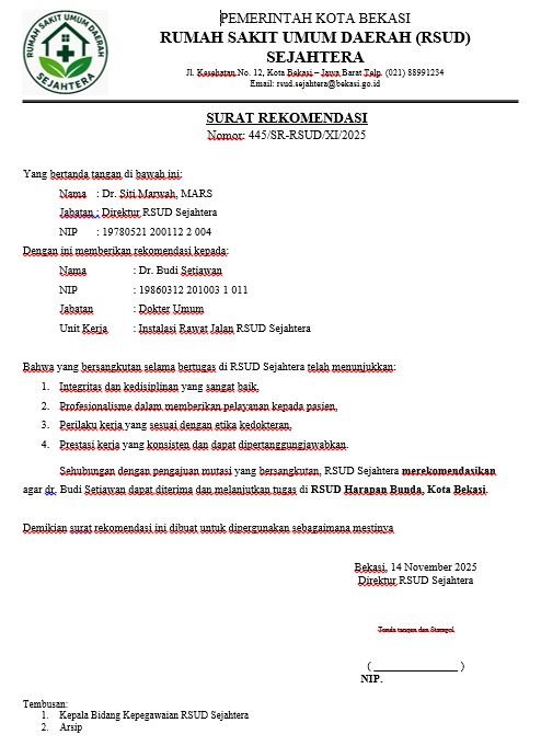 Surat rekomendasi adalah surat dukungan yang berfungsi untuk memberi penilaian positif dari pihak yang lebih berwenang mengenai kualifikasi, karakter, dan potensi seseorang untuk keperluan tertentu. Kegunaan utamanya adalah untuk mendukung aplikasi pendaftaran sekolah (termasuk beasiswa), melamar pekerjaan, atau mengikuti program tertentu seperti program magang. Surat ini memberikan perspektif pihak ketiga yang menambah kredibilitas aplikasi Anda di luar dokumen resmi seperti CV atau transkrip nilai. Berikut contoh format surat rekomendasi dan filenya: